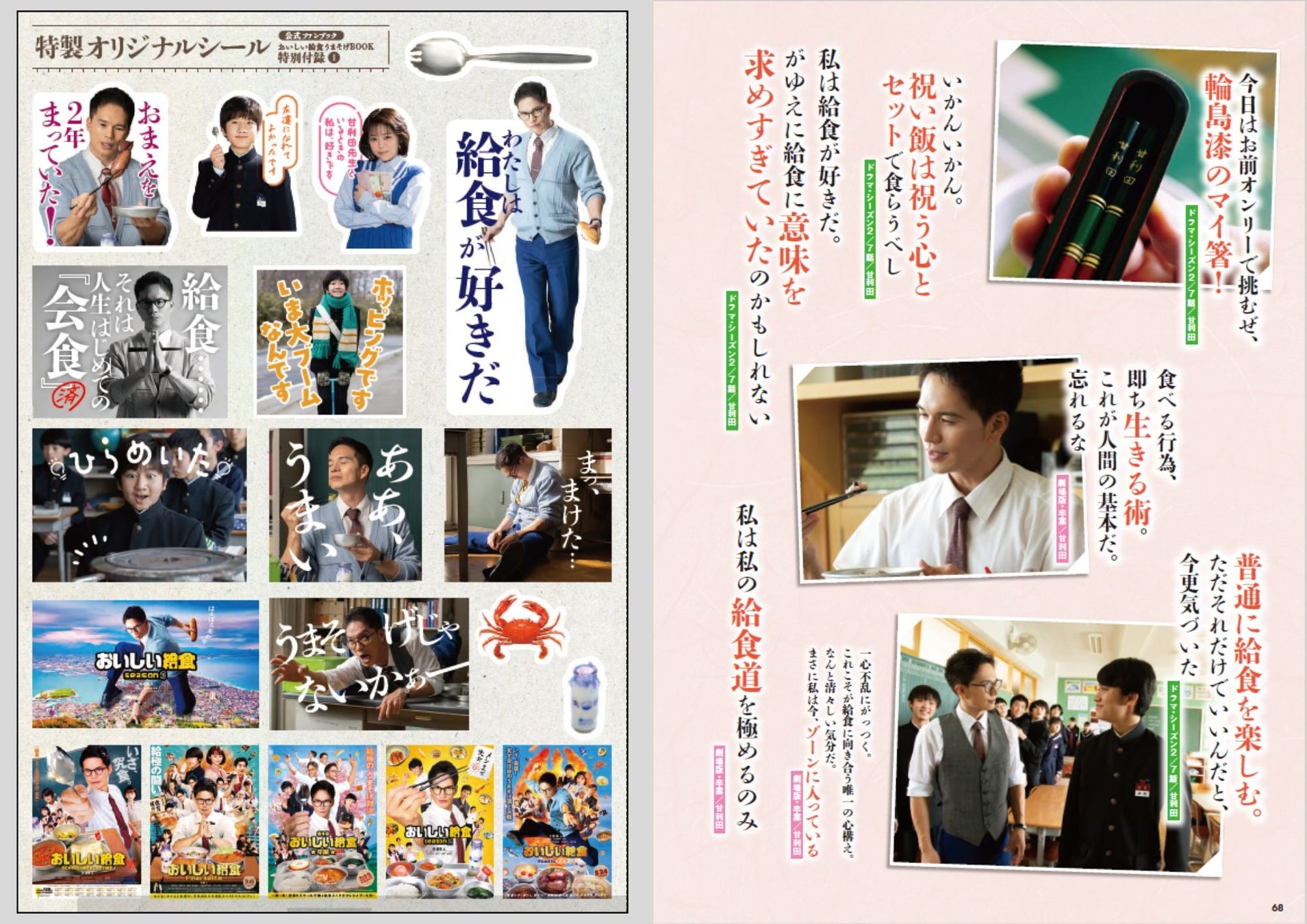 本書は、2019年に放送されたテレビドラマ「おいしい給食」第1作から第3作と過去劇場版2作品までの振り返りガイドと、2024年5月24日(金)より劇場公開される最新劇場作「おいしい給食 Road to イカメシ」の見どころなどを収録した初の公式ファンブックです。ほかにも、主演の市原隼人さんのロングインタビューや、東京都足立区の中学校へ訪問したレポート記事などファン必読のコンテンツが目白押し。2大付録は名言で構成された特製シールといつでもおいしい給食気分に浸れるファン感涙のあの給食献立がプリントされた特製シート!
