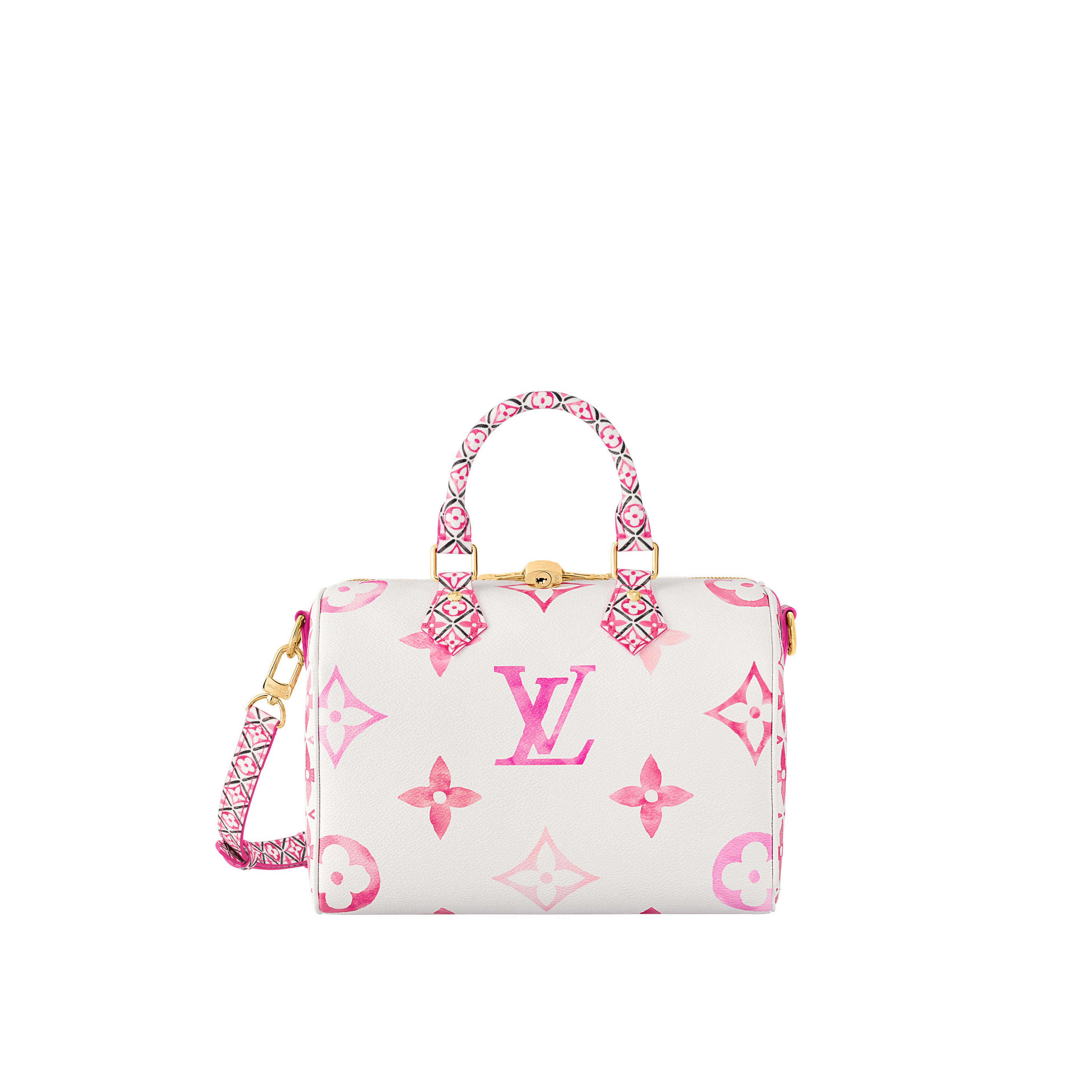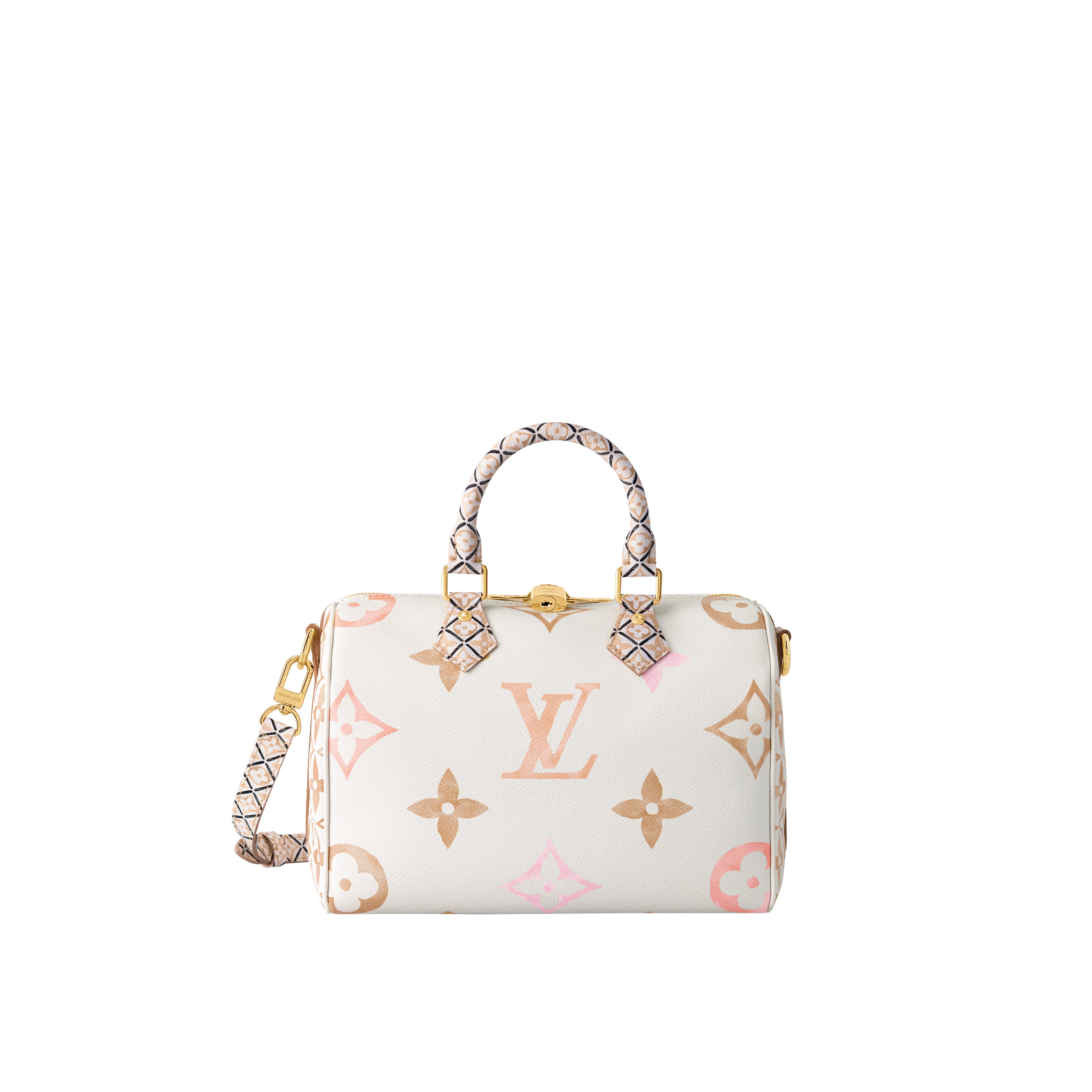 「スピーディ·バンドリエール 25」は、トリミング、ハンドル、ハンドルマウント、ライニングに、パリ近郊のアニエールに佇むメゾンのアトリエのタイルから着想を得た複雑なモチーフを、バッグの他のパーツと同系色であしらいました。