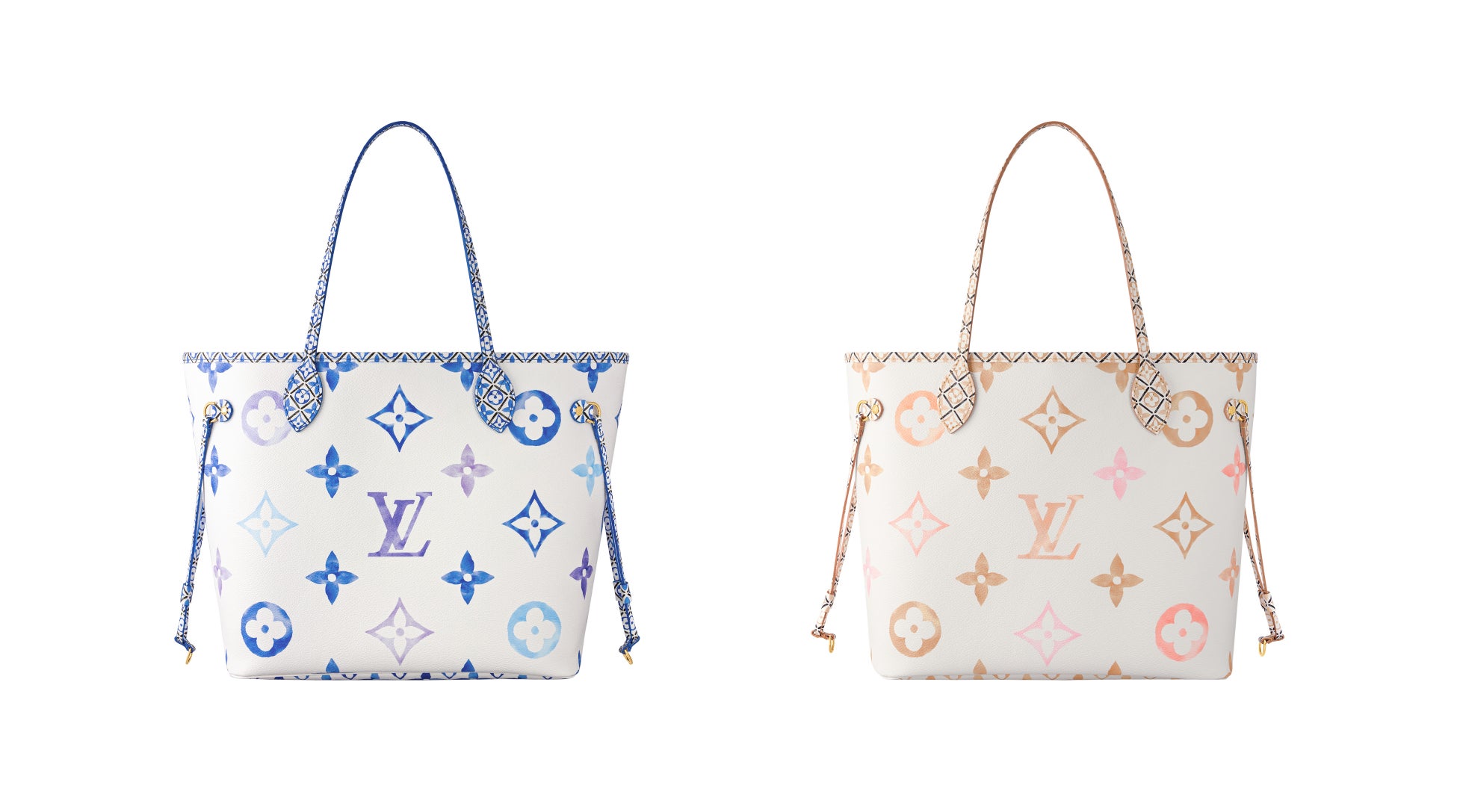 夏らしい雰囲気の「ネヴァーフル MM」は、LV シグネチャーとモノグラム・フラワー モチーフを水彩画風に不規則に配置しました。トップに施したトリミング、ハンドル、ハンドルマウントには緻密なモノグラム・フラワー パターンがあしらわれています。