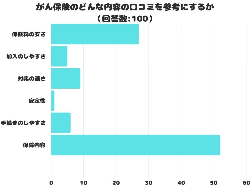 がん保険のどんな内容の口コミを参考にするかをアンケートにて調査したところ、1位は「保障内容」でした。