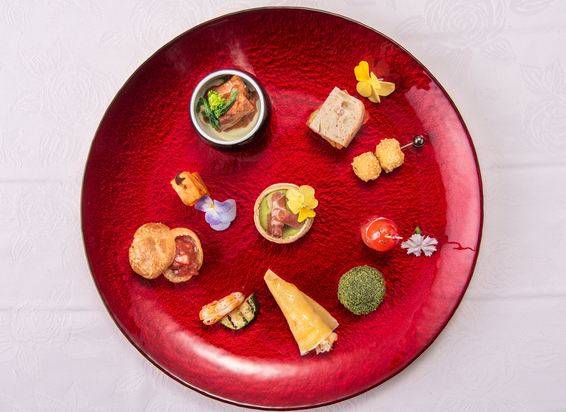 まずは、赤か緑のアペリティフで乾杯。続いて、まるごとマッシュルームに抹茶のヴィエノワーズをのせた「マッシュルームのソテー ハーブと抹茶のヴィエノワーズ」、カニの身と苺、グレープフルーツをクレープで包んだ「カニと苺、グレープフルーツのクレープ」、アボカドとトラウトサーモンをライ麦パンでサンドした「アボカドとトラ
