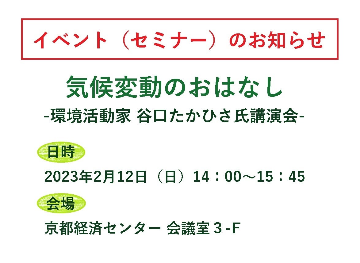 京都府と「京と地球(アース(あす))の共生府民会議」では、国連総会でスピーチされた環境活動家の谷口たかひさ氏による講演会を2月12日(日)に開催します。地球温暖化による気候変動が拡大する中で、「今、私たちに何ができるか」をテーマに、気候変動の現状や気候変動に対する活動事例について、リアルな映像や画像、また谷口氏ご自身の経験を交えてお話しいただきます。参加費は無料で、参加は事前申込制となっております。(申込期限:令和5年2月10日(金)正午)この機会に、是非一緒に気候変動について考えてみませんか?