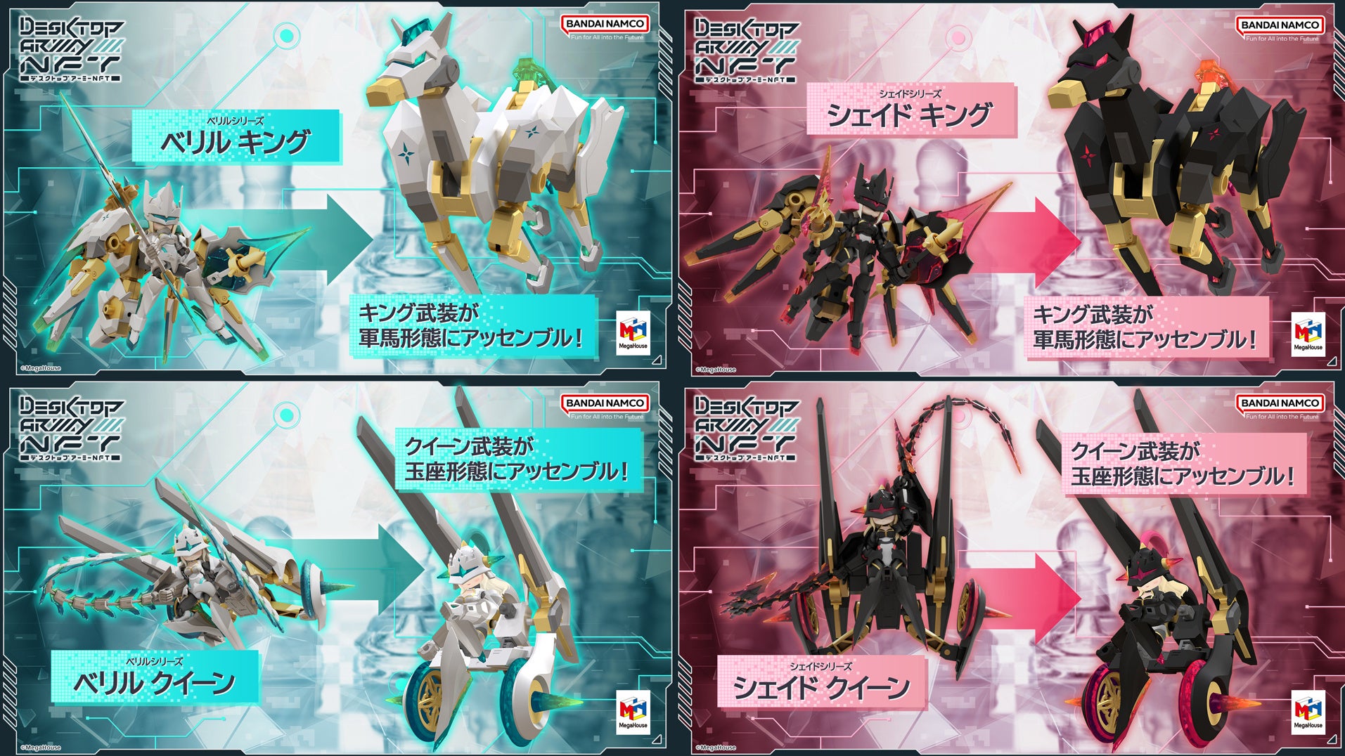 シリーズ第2弾となる「ベリル」「シェイド」の大型武装として、「ベリル キング」「ベリル クイーン」「シェイド キング」「シェイド クイーン」が登場となります。それぞれ武装パーツの組み合わせによって、キングでは「軍馬形態」、クイーンでは「玉座形態」に組み立てが可能となります。