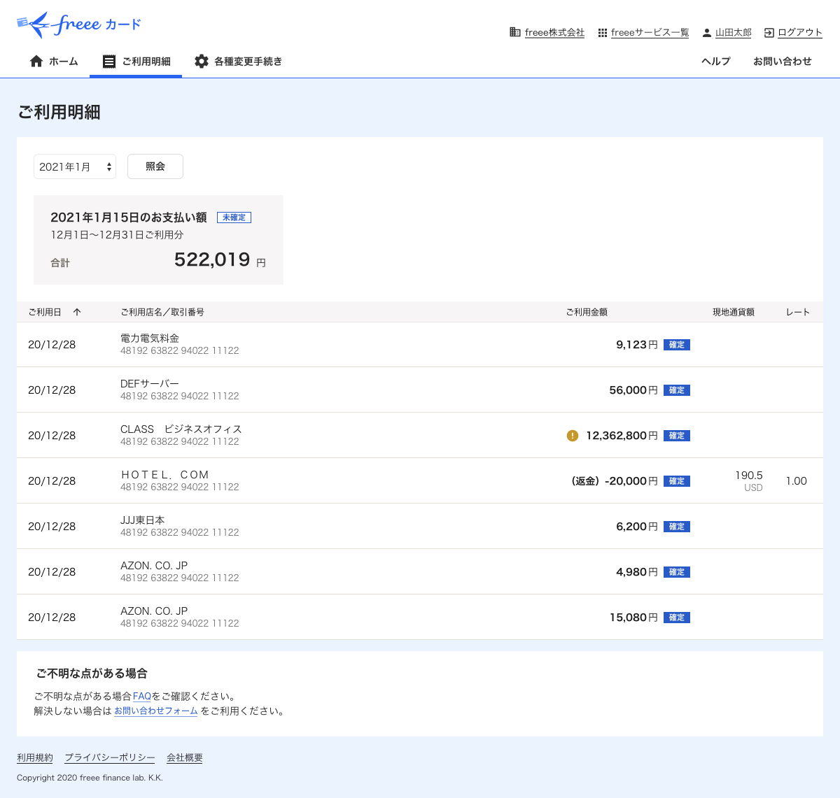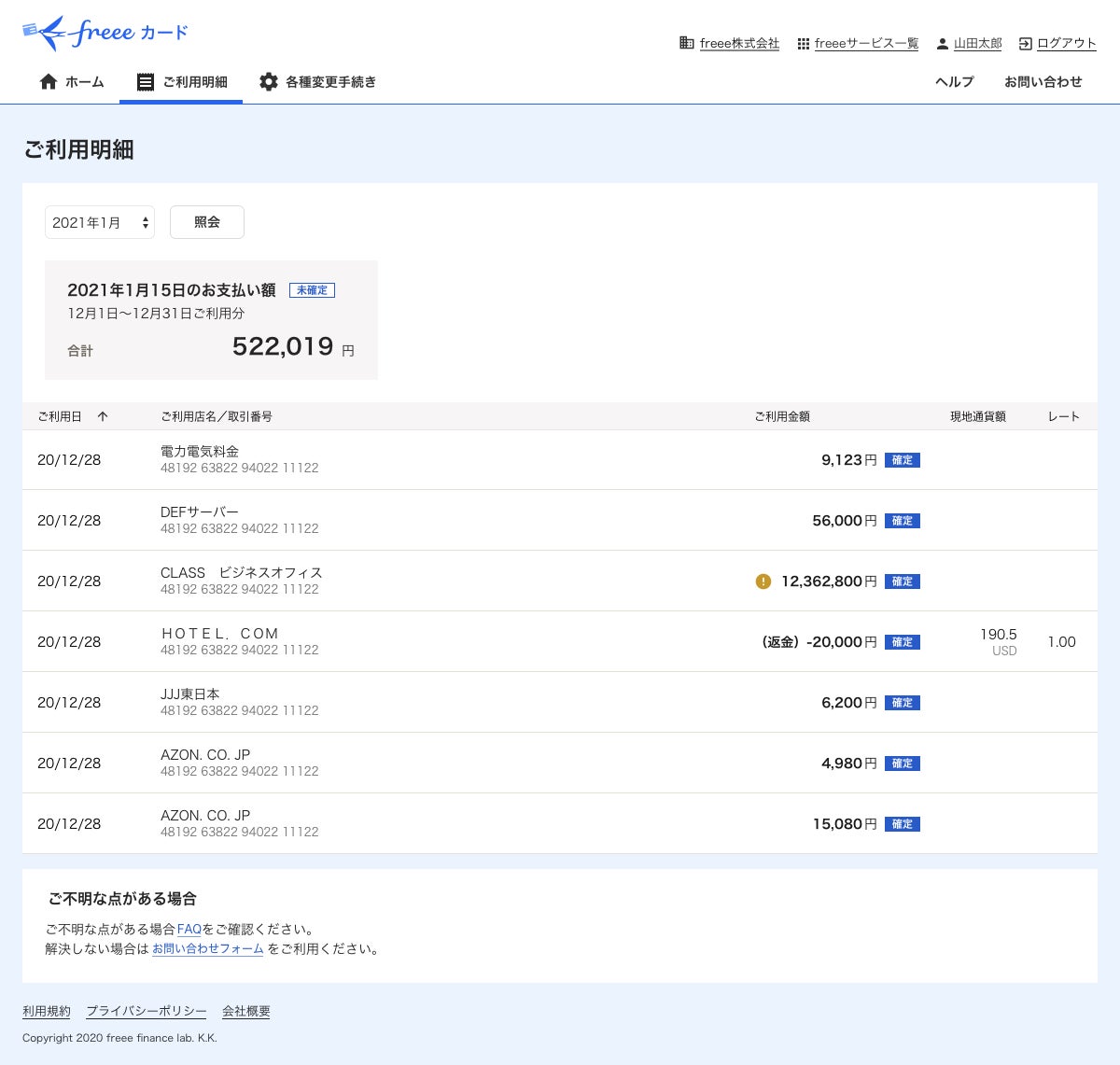 利用から数日以内に全ての利用明細が、freee会計に同期されます。