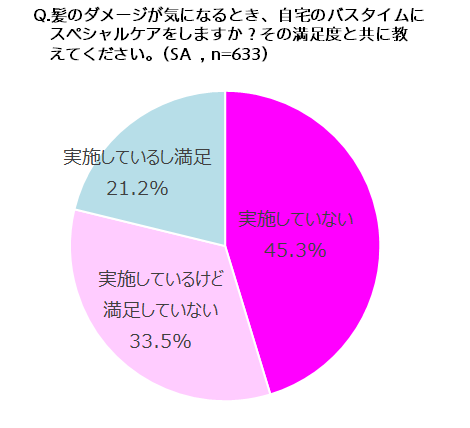 - 自宅バスタイムでの髪のスペシャルケア、実施して満足しているのはわずか5人に1人!4割以上が未実施の理由は!?