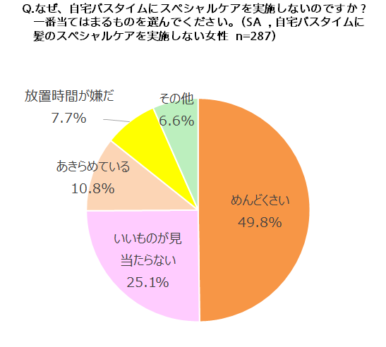 髪のダメージが気になるとき、バスタイムでのスペシャルケアに満足しているのはたったの21%で、「実施しているけど満足していない」と答えた女性は3人に1人となっています。一番多かった「実施していない」と答えた女性は45%でした。未実施の理由は、「めんどくさい」が約半数、「いいものが見当たらない」が25%、「あきらめている」が10%となっていました。スペシャルケア未実施の女性の4人に1人が、お気に入りに巡り合えていない状況です。