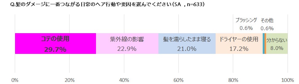 髪のダメージに最もつながる日常的なヘア行動の1位は「コテの使用」で約3割となりました。熱機器を直接髪に当てるコテ使用はダメージヘアに直結するイメージが強いようです。