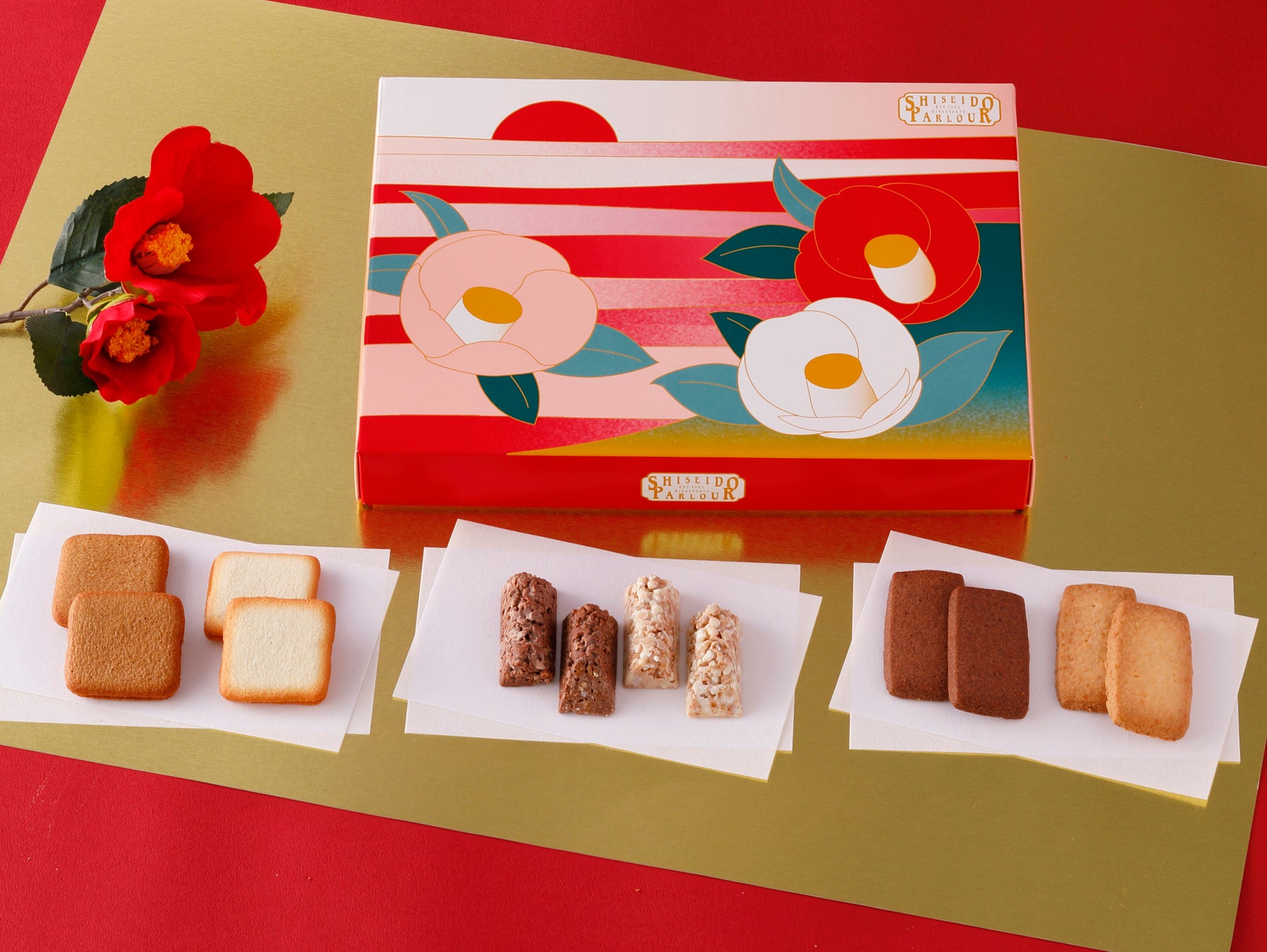 資生堂パーラーの菓子詰め合わせ『ニューイヤーズスイーツ』。今年は一年の幸福を願い、新しい年を力強く照らす陽の光を受け、神々しく咲き誇る椿の姿が描かれた、新年にふさわしい華やかなパッケージで登場します。新年の始まりを祝う贈りものとしてはもちろん、お正月に大切な方と集まる団らんの時間のお供としてもおすすめです。