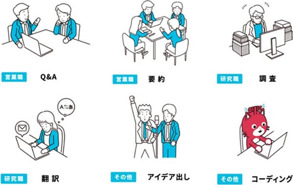 営業職から研究職、医療職、さらにはお笑いのネタづくりまで!? さまざまな用途(ニーズ)を幅広くサポート。営業の現場の場合、たとえば100種類以上の製品を取り扱う現場で顧客からの質問に情報検索で回答したり、議事録をPCで作成したり。また、研究職では大量の論文を登録したうえで要約をしたり、翻訳をしたりと、「ailia DX Insight」は多様な職域での活用が期待されます。
