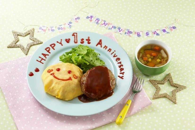 1周年を記念して提供するイベント献立は、これまでご利用いただいたお客さま、お子さまに感謝の気持ちを込めて、子どもたちが大好きなハンバーグとオムライスをワンプレートにしたごちそうプレートをお届けします。野菜もしっかりとれるよう、副菜は野菜のスープにして食べやすくしました。