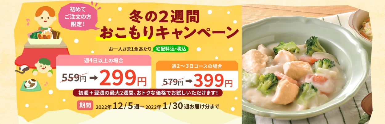 これから「PAKU MOGU」を始める方は、週4日以上のご注文でお一人さま1食あたり299円よりご注文できる「冬の2週間おこもりキャンペーン」をご利用いただけます。初週お届け分注文締切日は1月18日(水)。