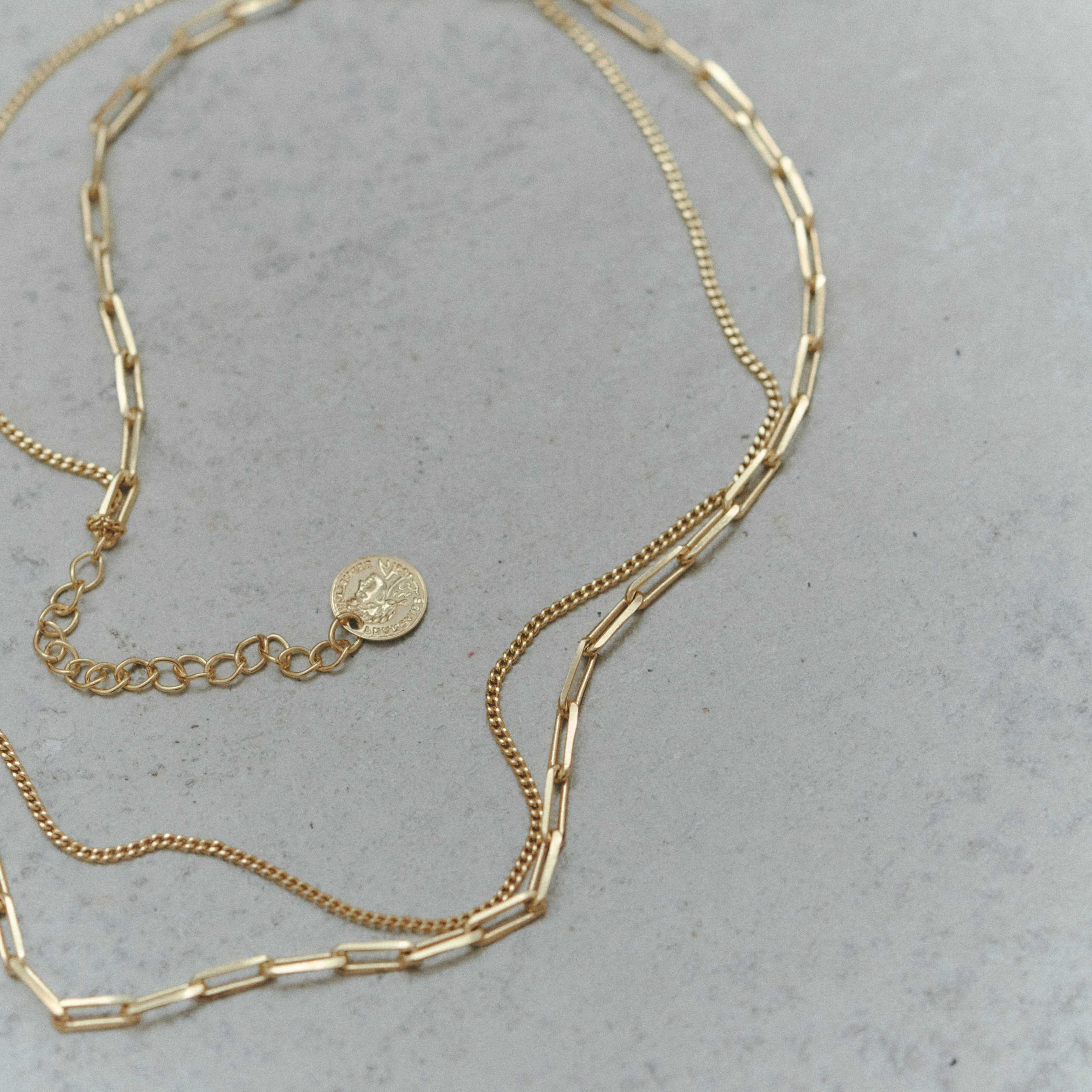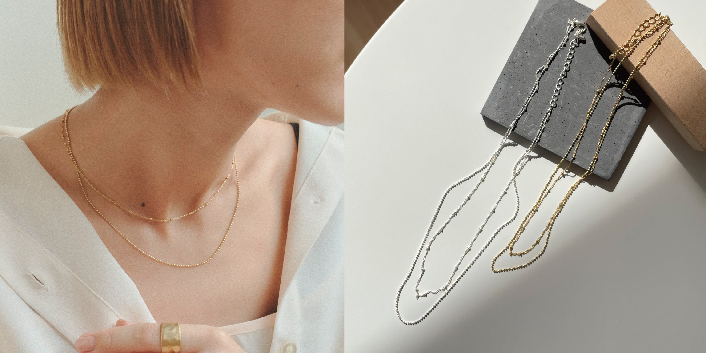 2連でもごちゃつかず、すっきりとしたコーディネートに。細身のチェーンが華奢で上品な印象を与えてくれます。