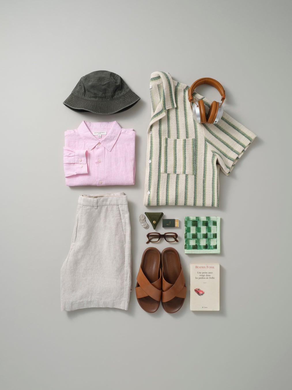 ストライプ ニット リゾートシャツ 13,000円/ スタンダードフィット リネンシャツ 15,000円/ 9インチ リネンショートパンツ 14,000円/ レザースライドサンダル 18,000円/ コットンキャンバス バケットハット 8,000円/ シグネチャーバンダナ 8,000円