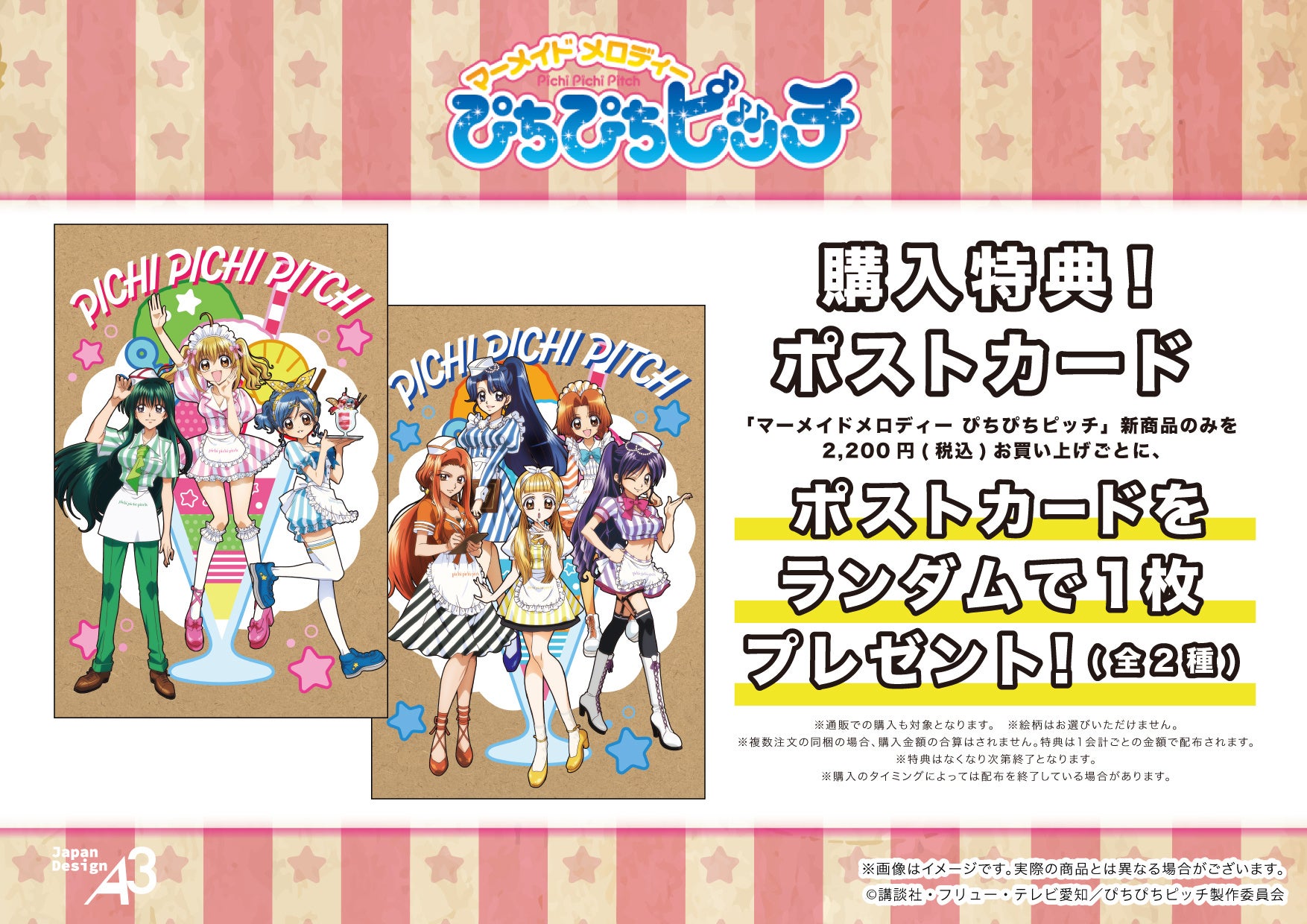 TVアニメ『マーメイドメロディー ぴちぴちピッチ』の新作グッズのみを2,200円(税込)お買い上げごとに、ポストカード(全2種)をランダムで1枚プレゼントします。