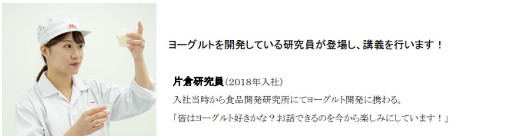 当社の基幹工場の一つである神戸工場では、現在リモートによる工場見学を受付けています。今回の特別企画では、 通常のオンライン工場見学でご案内している製造工程や商品のヒミツの紹介に加え、ヨーグルトを開発している研究員が 登場します!また、参加いただくお子さんは“こども記者”となって、研究員にインタビューを行っていただき、ヨーグルトや 研究のお仕事について学べます。