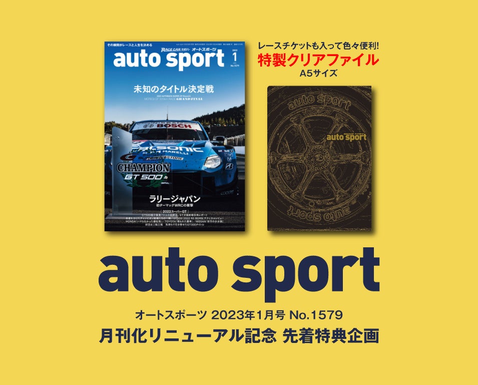 一部書店様限定で「auto sport 2023年1月号」をご購入のお客様に先着で、レースチケットも入る便利なA5サイズ「特製クリアファイル」をプレゼントしております。ぜひ、お近くの書店で「auto sport 2023年1月号」を買って、リニューアル記念の特典をゲットしてください!