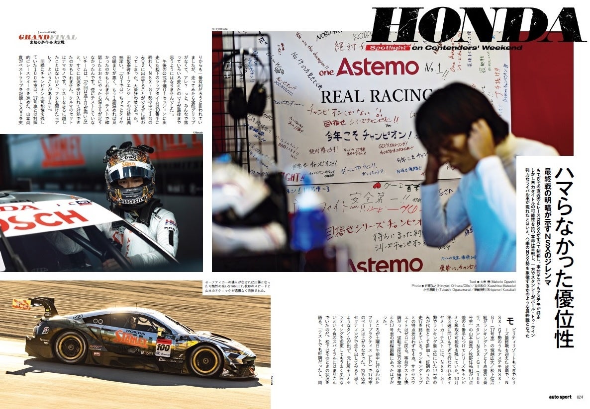 もてぎでの直近の4レースはすべてNSXが制覇。事前テストも順調で盤石かと思われた最終戦。しかし、自力でのタイトル獲得の可能性のあるAstemo NSX-GTが苦戦する一方で、そのチャンスを少なからず持つSTANLEY NSX-GTがポール・トゥ・ウイン。そしてチャンピオンはライバルの手に。今季のNSX勢を象徴するレースとなってしまった。