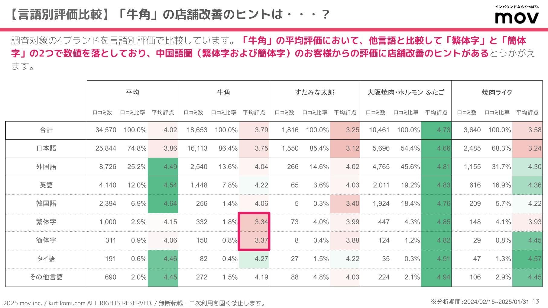 「牛角」の平均評価において、他言語と比較して「繁体字」と「簡体字」の2つで数値を落としており、中国語圏(繁体字および簡体字)のお客様からの評価に店舗改善のヒントがあるとうかがえます。