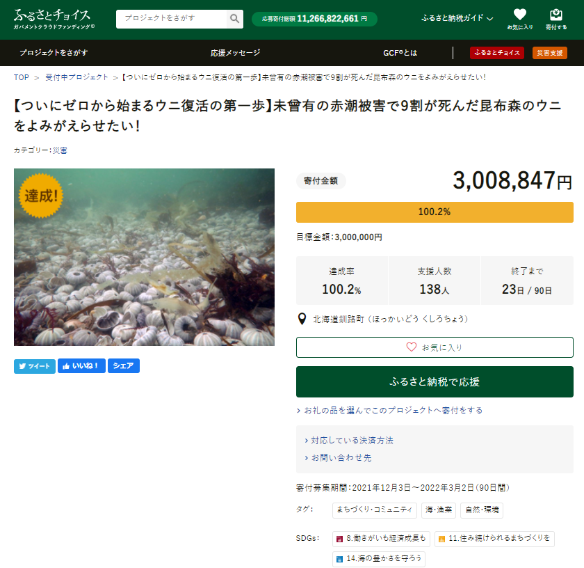 釧路町とふるさと納税総合サイト「ふるさとチョイス」(https://www.furusato-tax.jp/)を企画・運営する、株式会社トラストバンク(本社:東京都渋谷区、代表取締役:川村憲一、以下「トラストバンク」)は、2月7日深夜にトラストバンクが提供する、ふるさと納税制度を通じてクラウドファンディング型で寄付を募る仕組み「ガバメントクラウドファンディング®」(以下GCF®)で、300万円の目標金額を達成しました。この資金調達は赤潮被害を受けた昆布森のウニ事業者の支援を目的としたプロジェクトで2021年12月3日から2022 年3月2日の間、寄付を募っています。目標金額は達成しましたが、募集期間内は引き続き寄付を受け付けます。