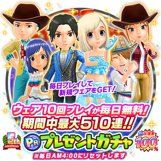 5周年記念&感謝の気持ちを込めて、期間中、ウェアガチャの10回プレイが毎日1回無料でプレイができる「5周年PRプレゼントガチャ」を開催いたします。今回の特別なガチャはなんと!プラチナランク(PR)出現確率が100%となっています!