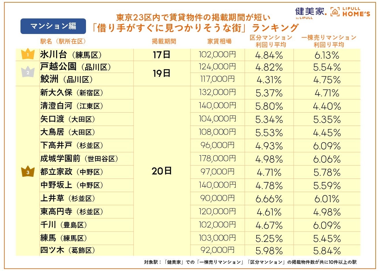 事業を通して社会課題解決に取り組む株式会社LIFULLのグループ会社であり、不動産投資と収益物件の情報サイト「健美家(以下、健美家)」および「LIFULL HOME'S 不動産投資」を運営する健美家株式会社(代表取締役社長:成瀬 亮輔)は、株式会社LIFULLが運営する不動産・住宅情報サービス「LIFULL HOME'S」のデータを活用し、賃貸物件の掲載期間をもとに東京23区内の賃貸マンション・アパートの借り手がすぐに見つかりそうな街ランキングを発表しました。
