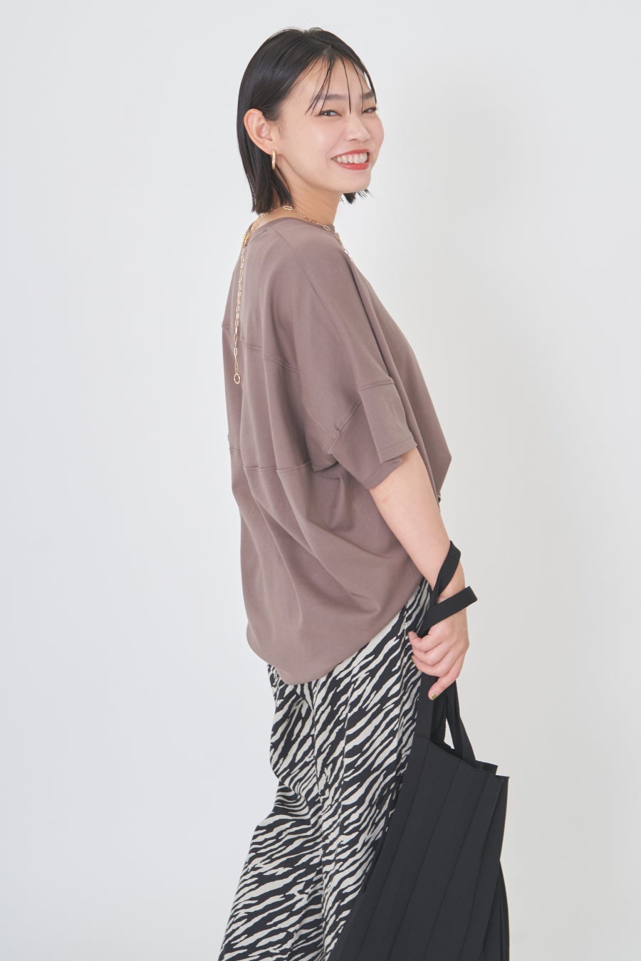 大人気アイテム『ラク映えプルオーバー』は、紫外線を通しにくい加工を施した「UVカット」と、触れた瞬間ひんやりとする「接触冷感」の2つの機能を兼ね備えたプルオーバーです。素材は、綿100%で通気性や肌触りのよいものを使用しております。1枚で着映えする丸みのあるコクーンシルエットになっており、フロントの切替や長めの袖丈など体型カバーができるのもポイント。シンプルなデザインで着回しがしやすく、コーディネートに悩まず手軽に着ていただける“時短でコスパ最強”の“ラク映え”アイテムです。