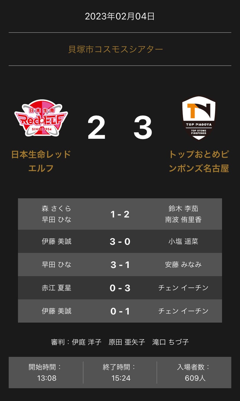 ノジマTリーグ 2022-2023シーズン 公式戦 2月4日開催 日本生命レッドエルフ vs トップおとめピンポンズ名古屋 試合結果