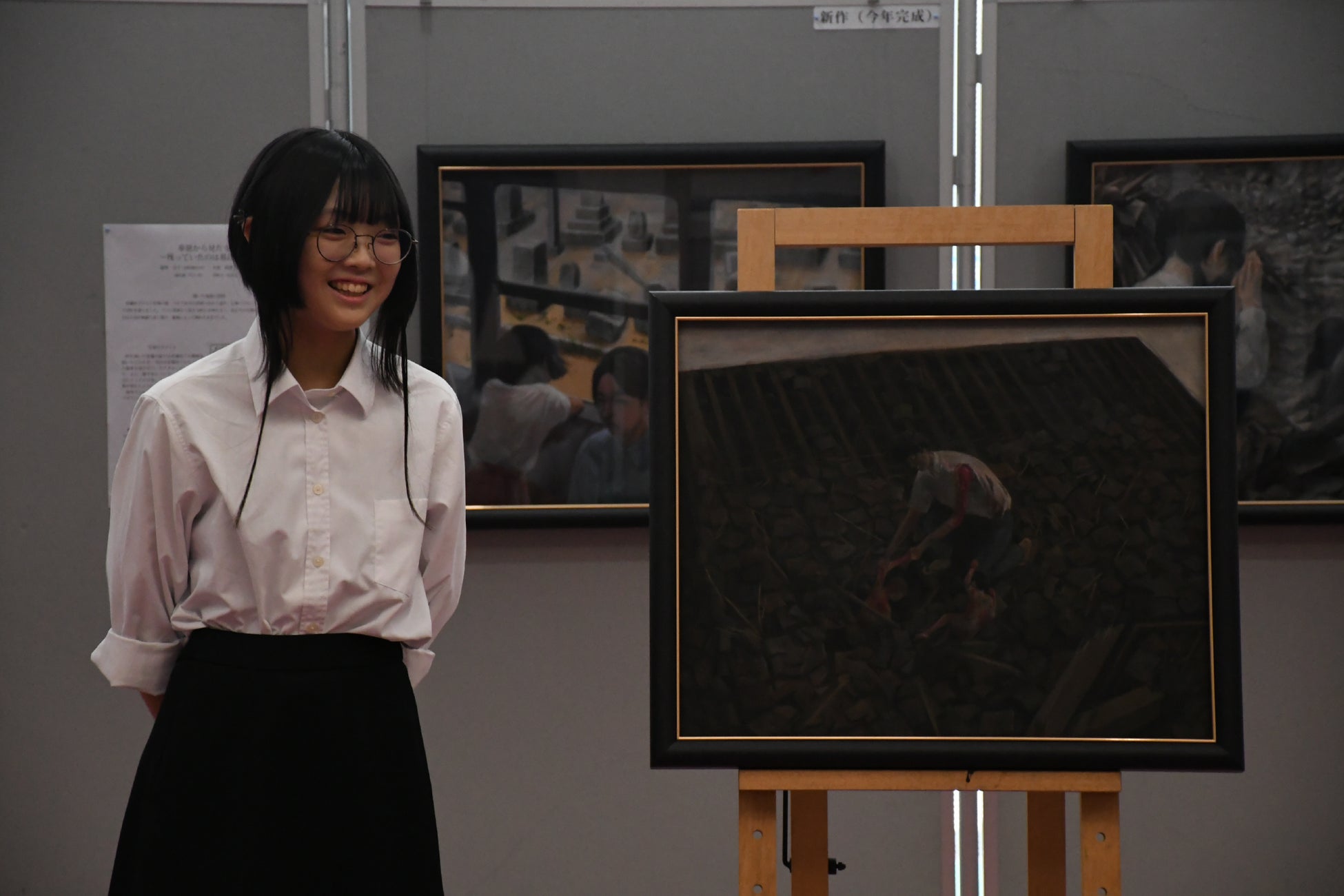 「言葉だけでは伝えることが難しいことを証言者さんと油絵で表現しています。私には想像を超える出来事で、当時の資料にあたったり、10回以上聴きとりをして完成できました。子どもたちを必死に助け出そうとする母の表情が難しかったのですが、必死になる鬼の形相の中にも母のやさしさを表現しました」と描いた作品について説明。