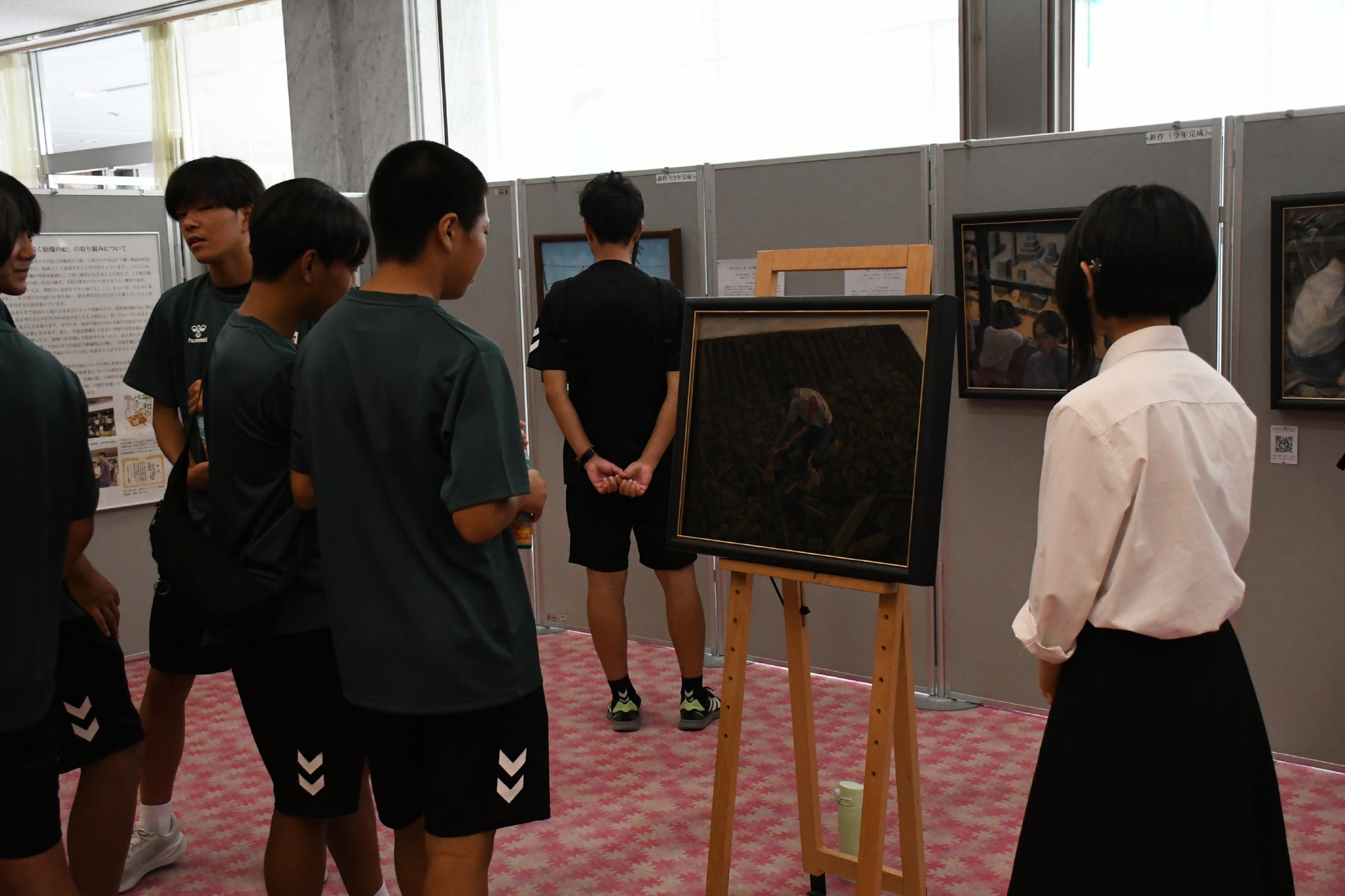 今年の平和学習は試合の翌日8月8日に実施。広島平和記念資料館を見学した後、広島国際会議場で行われている『原爆の絵画展』(8月20日まで開催)を訪問。広島市立基町高校の生徒が、被爆体験証言者と共に原爆被害の実相を訴えるために取り組んでいるもの。この日は、8か月かけて描いたという高校3年生の中原さんが展示の紹介もしてくれました。