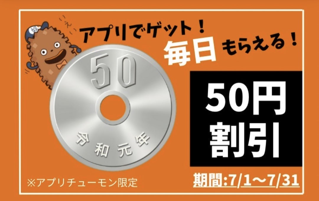 内容:公式アプリ「アプリチューモン」内にて、「50円割引クーポン」を毎日配布します。「50円割引クーポン」を取得後、アプリからの商品注文で、合計金額から毎日50円引きとなります。