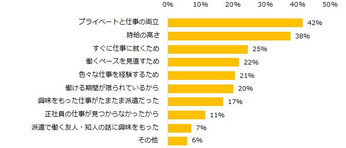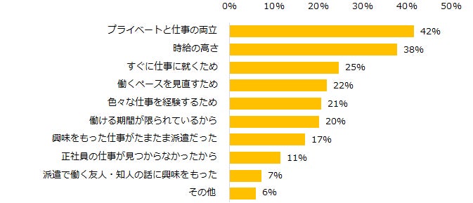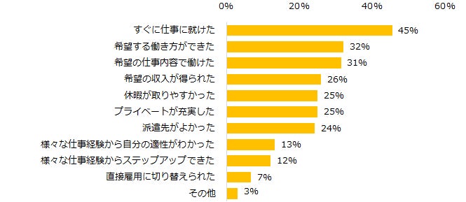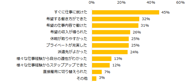 派遣で働いた経験がある方に「今までに”派遣で良かった”と思ったことはなんですか?」と伺うと、上位は「すぐに仕事に就けた」(45%)、「希望する働き方ができた」(32%)、「希望の仕事内容で働けた」(31%)でした。