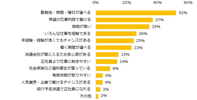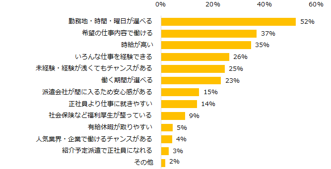 「派遣で働くことに興味を持ったきっかけ・理由は何ですか?」と質問すると、トップは「プライベートと仕事の両立」(42%)でした。続けて、派遣のメリットだと思うことを伺うと、第1位は「勤務地・時間・曜日が選べる」(52%)でした。具体的な理由も紹介します。