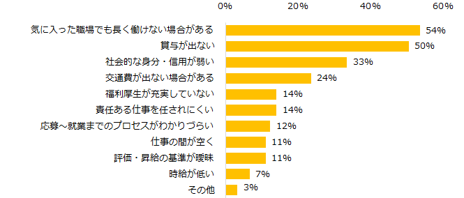 ・正社員でないとローンが組みづらいなど、社会的な信用がまだまだ低い部分がある。(30代男性)