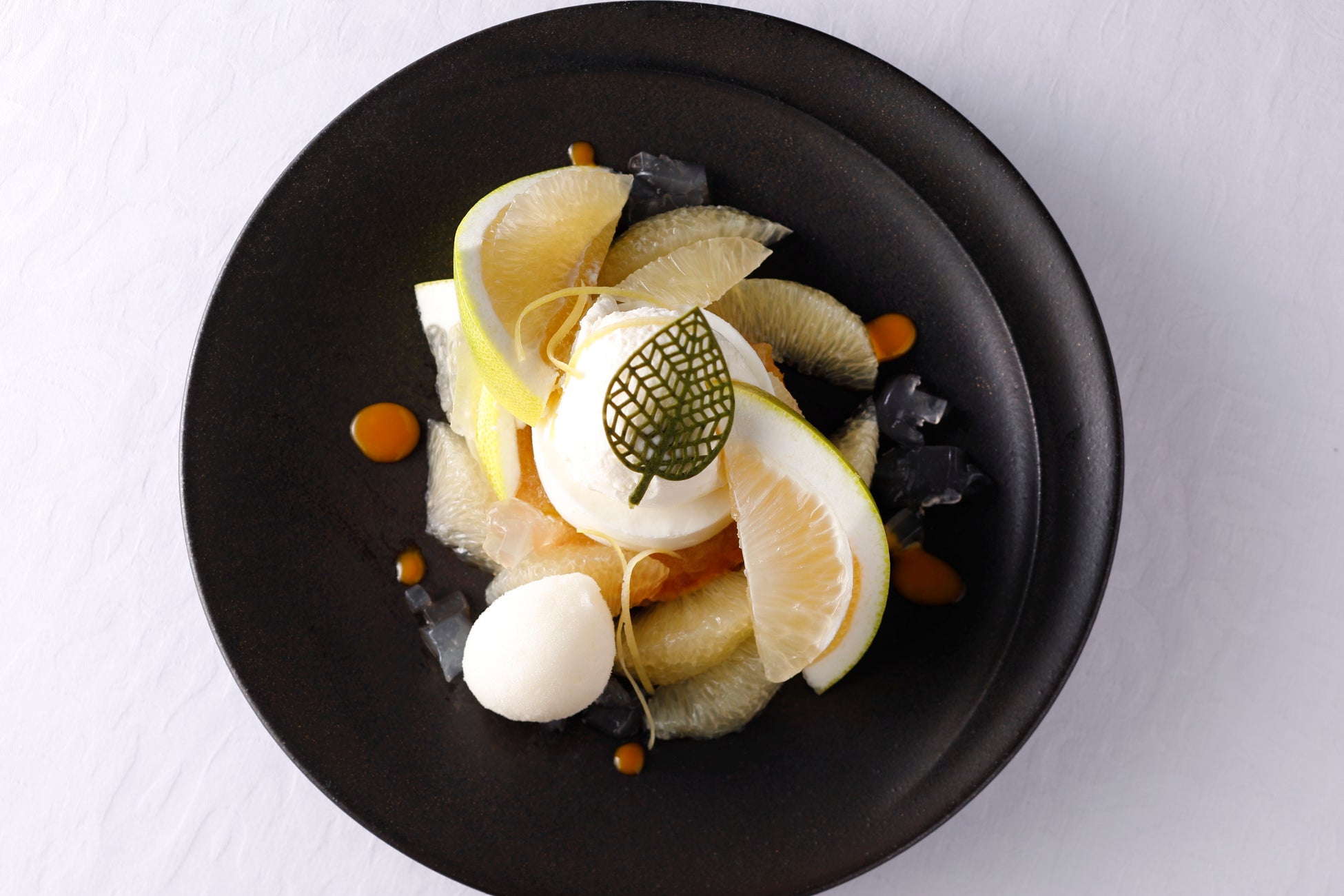 旬のみずみずしい“水晶文旦”と、さわやかなフロマージュブランの口どけ、鼻からぬけるベルガモットソルベの香りをお楽しみください。