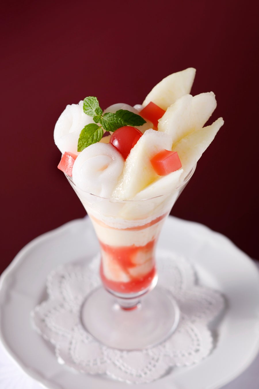 旬の風味豊かな洋梨“ル・レクチェ”を主役に仕立てたパフェです。洋梨のゼリーや自家製アイスクリームとの組み合わせをお楽しみください。
