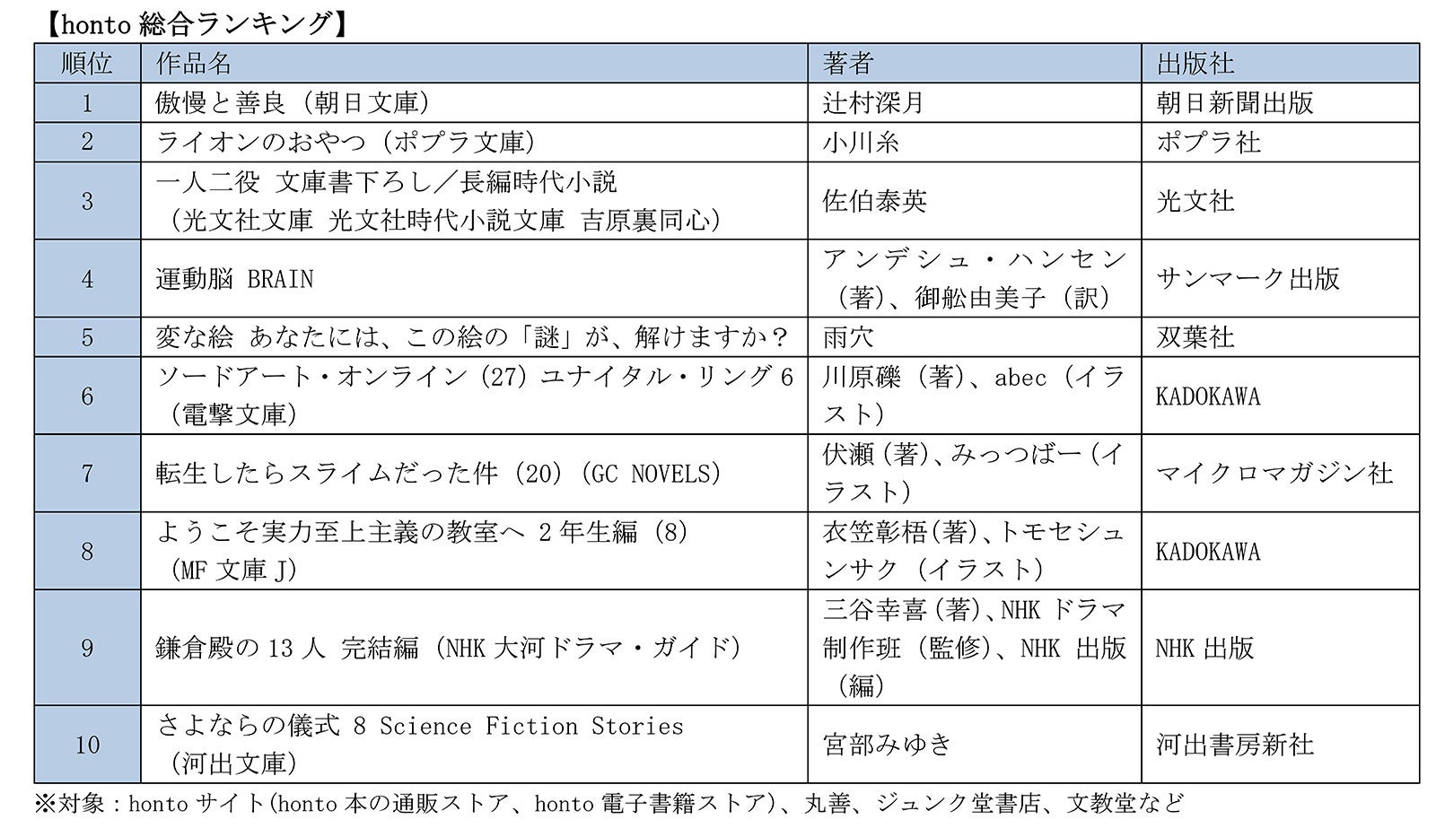hontoランキングは、honto サイトと、honto サービス実施店の丸善、ジュンク堂書店、文教堂などで購入された書籍や電子書籍の販売データをもとに集計しています。