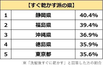 一方、髪へのリスクを抑えられる「洗髪後すぐに乾かす」と回答した割合が最も高いのは「静岡県」(40.4%)という結果になりました。約4割の人が正しいヘアドライを行っており、ヘアケア理解度の高さがうかがえます。