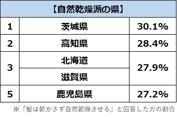 また、上記の回答を47都道府県別に見てみると、ヘアドライにおけるNG行動である「髪は乾かさず自然乾燥させる」と答えた人の割合が最も高いのは茨城県(30.1%)で、3割の人が回答しました。次いで2位が高知県(28.4%)、3位が北海道と滋賀県(27.9%)という結果になっています。
