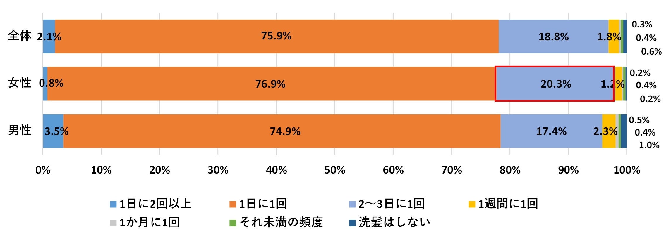 洗髪をする頻度について尋ねたところ、全体で約75%の人が「1日に1回」と回答し、大半を占める結果となりました。次いで「2~3日に1回」と答えた人が一定数おり、女性では20.3%と2割に上る結果となりました。