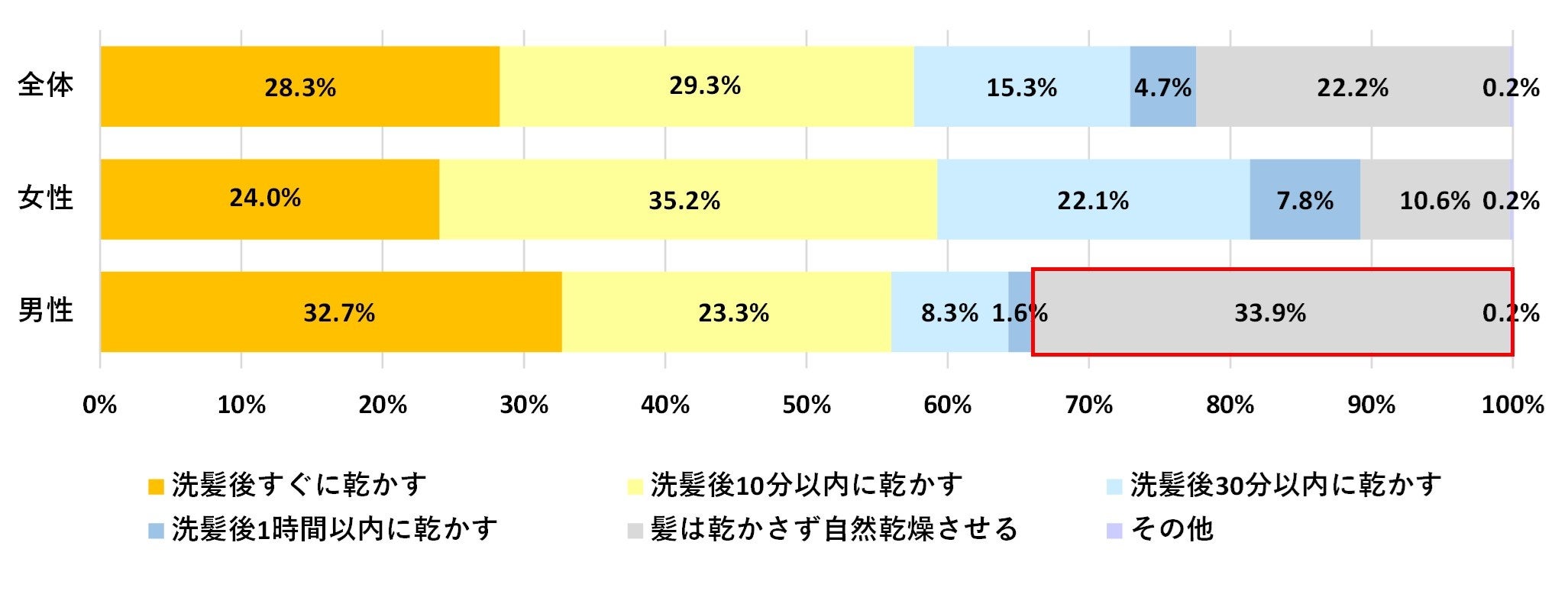 洗髪後、髪を乾かすまでの時間について尋ねたところ、全体では「洗髪後10分以内」(29.3%)がトップとなり、次いでわずかな差で「洗髪後すぐ」(28.3%)が2位となりました。男女別に見ると、女性では「洗髪後30分以内」と回答した人も22.1%と多くなった一方で、男性では「髪は乾かさず自然乾燥させる」(33.9%)と回答した人が3割にも上る結果となりました。