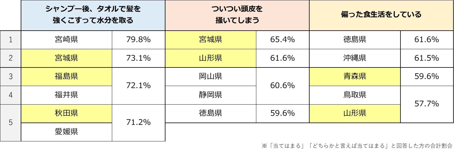 また、上記の質問で「当てはまる」「どちらかと言えば当てはまる」と答えた人の割合が50%を超えた上位の3項目について、47都道府県別に結果をランキングしました。「シャンプー後、タオルで髪を強くこすって水分を取る」では、宮崎県が79.8%でトップとなり、約8割の人が該当する結果となりました。2位の「ついつい頭皮を掻いてしまう」では宮城県、「偏った食生活をしている」では徳島県がそれぞれトップとなっています。