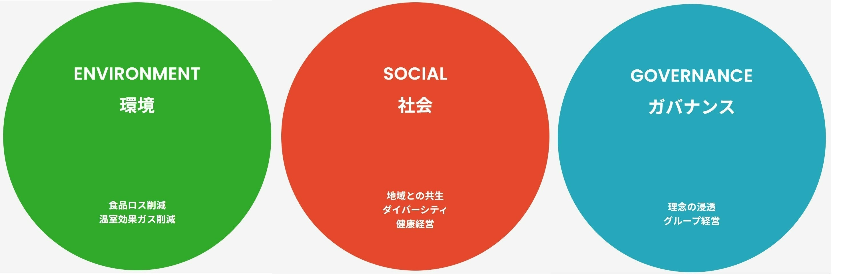 「Eat+&の幸せ」を、将来へと持続させていくために、「事業への影響」と「社会への影響」を考慮した「マテリアリティ(重点課題)」に基づき、「環境」「社会」「ガバナンス」の3つの視点より、7つの重点取組みテーマを選定。7つの分科会ごとに、取り組みを推進しています。
