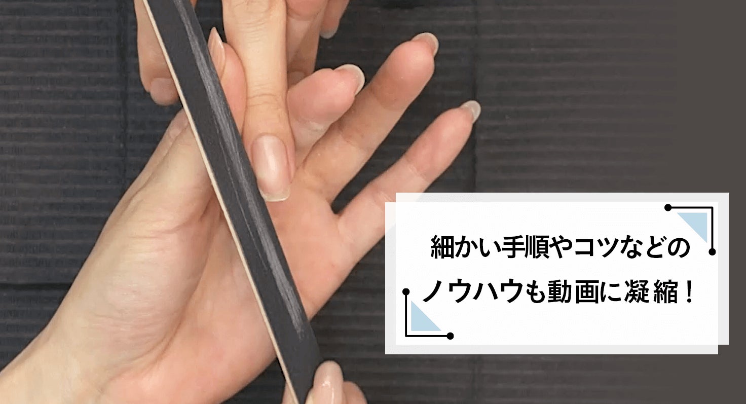 講義動画は「全体の流れ・用具の紹介~用具の持ち方・爪への当て方(角度)・仕上がり」など必要なすべての手順をやさしい言葉で噛み砕いて説明をしながら実演しています。また講義を担当する森上由理講師は、NPO法人日本ネイリスト協会の常任本部認定講師として「日本ネイリスト検定試験」を知り尽くしたエキスパートです。
