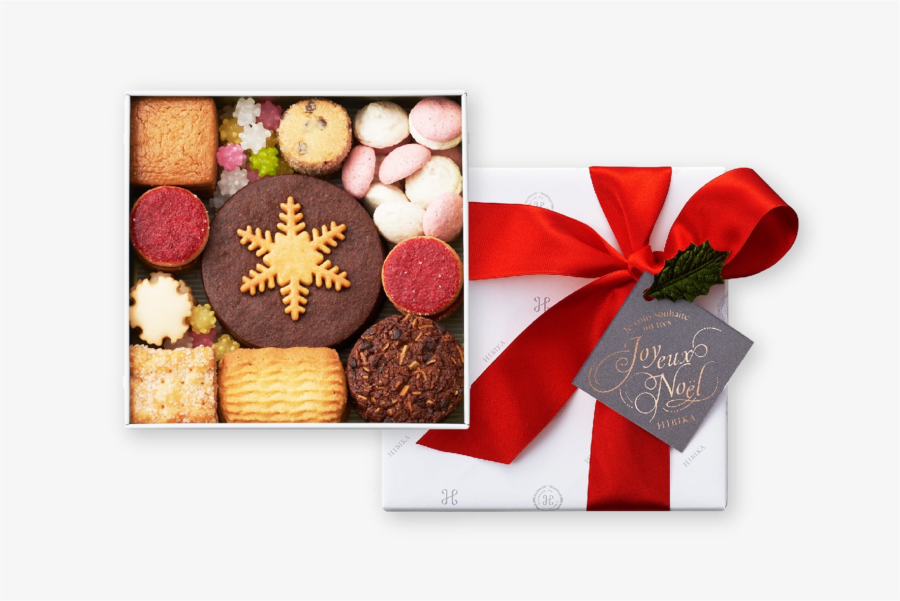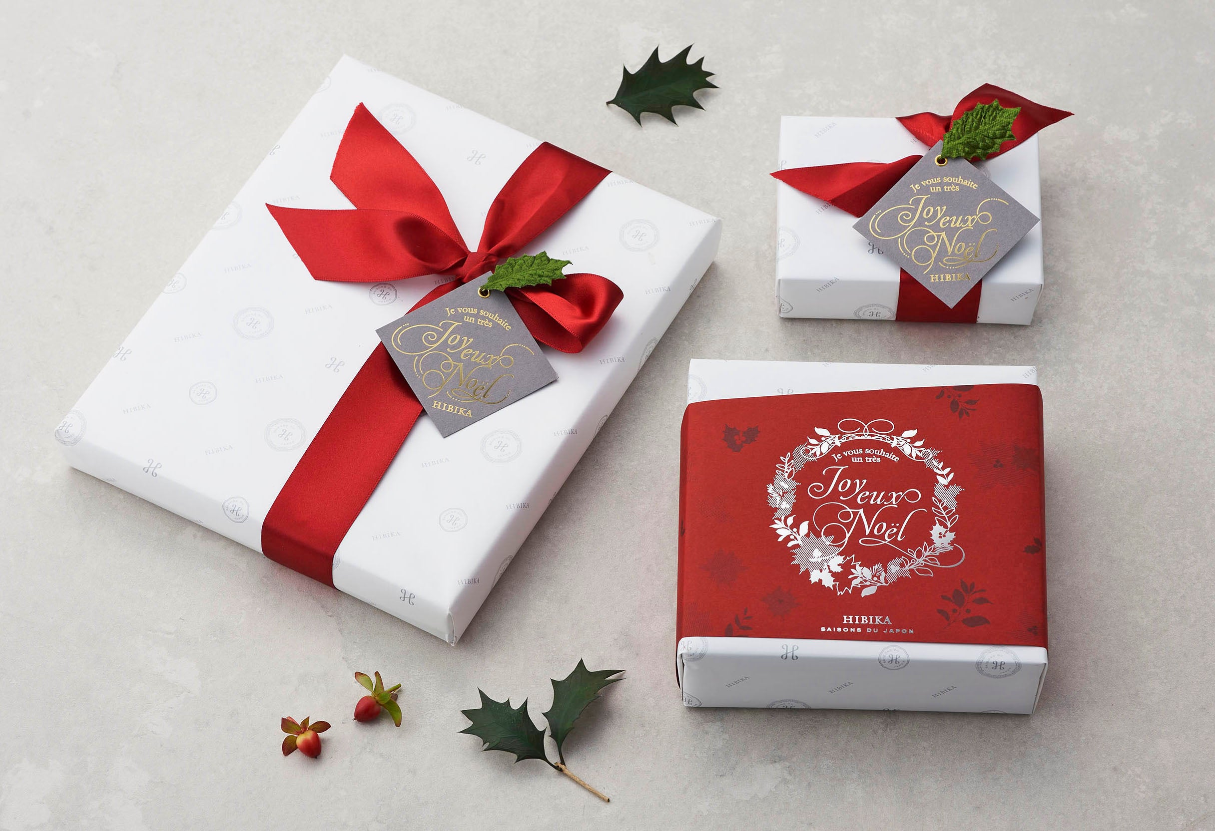 HIBIKAでは、家族や恋人、友人など、大切なひとと過ごすクリスマスが素敵な1日になりますように、という気持ちを込めて、赤いリボンにクリスマスタグと柊をあしらった華やかなクリスマス限定ラッピングをご用意しております。