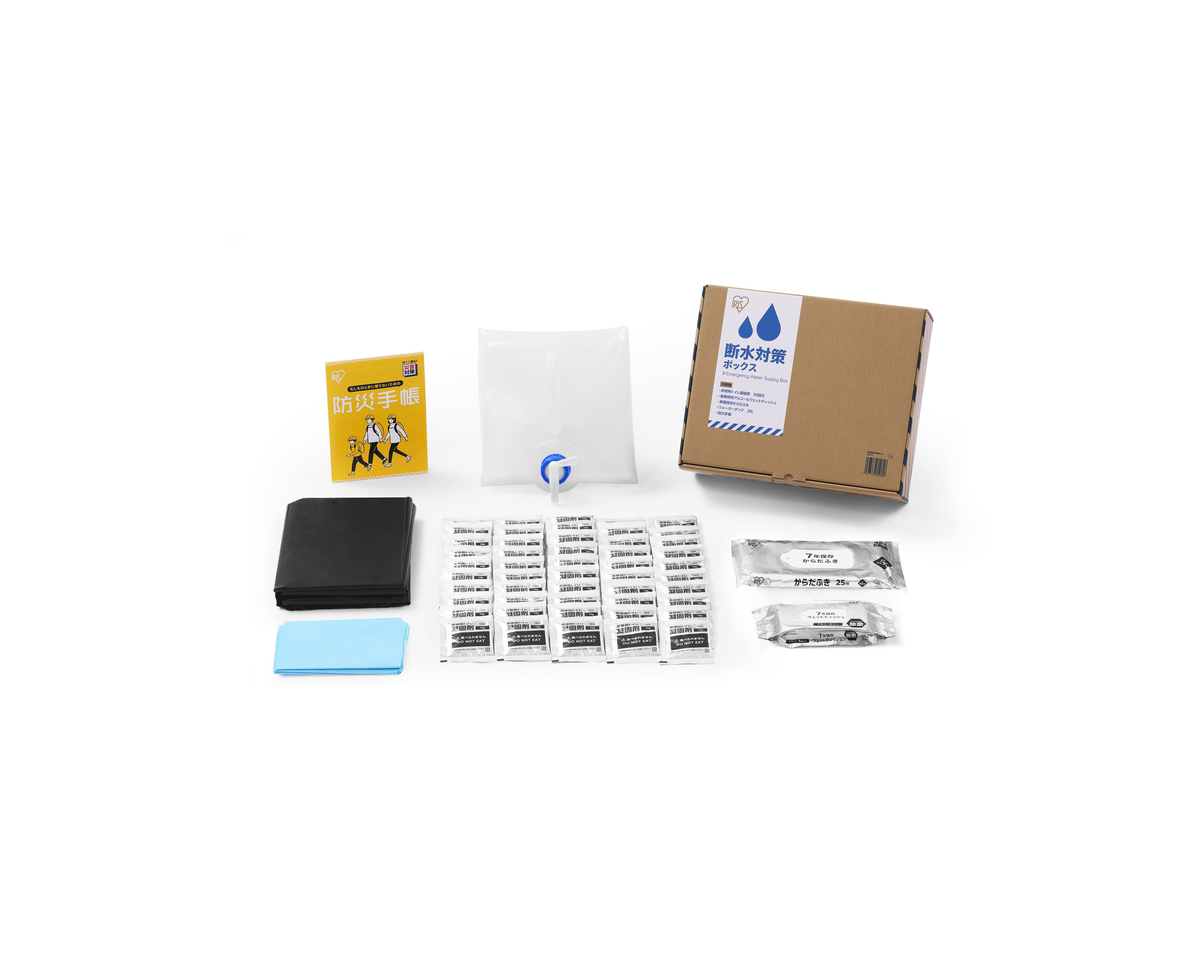 約1週間分の断水対策をサポートするセットです。災害時に特に問題となりやすいトイレや水道の利用制限に備え、トイレや手洗い、お風呂のケア、生活用水、飲み水の確保を支える用品を揃えています。断水発生後から復旧までを支える、1日5回×7日分以上のトイレ対策、1日3回×7日以上のお風呂対策、貯水ができるアイテムなどを厳選しています。