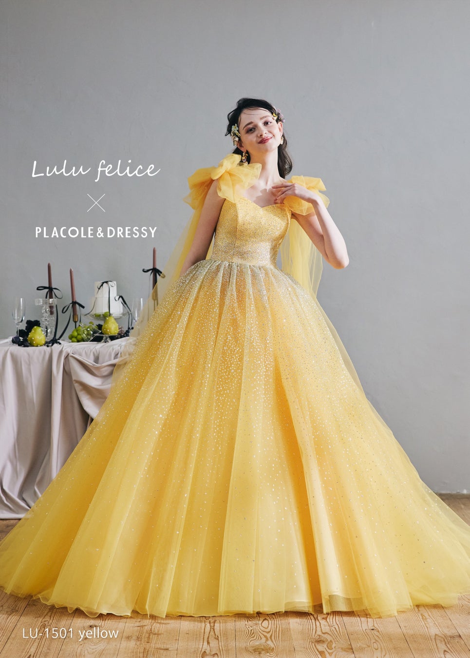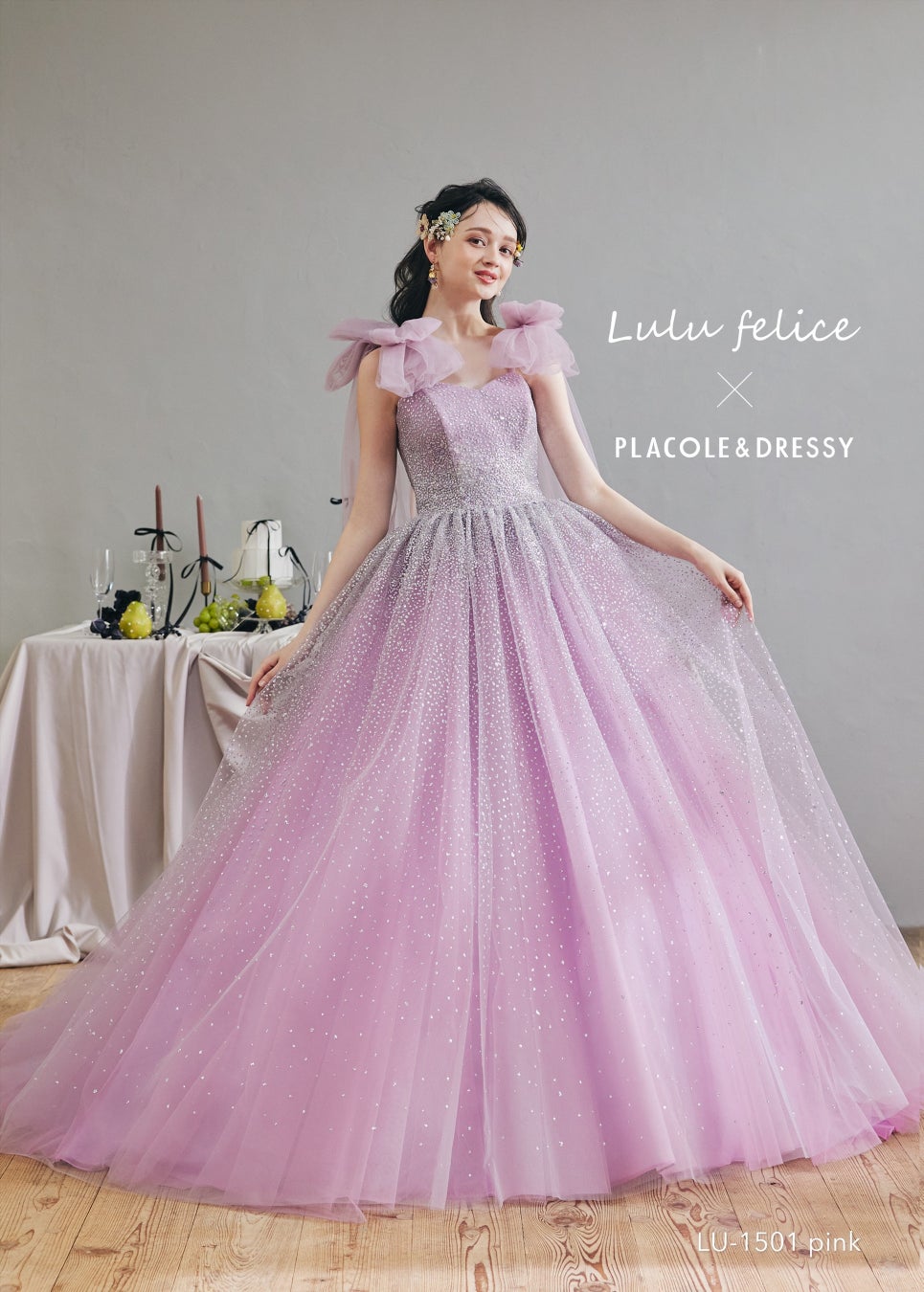 ボリュームのある肩リボンが、ふわふわかわいい1着。ドレス全体にグリッターが輝き、軽やかでかわいいカラー展開も魅力的。