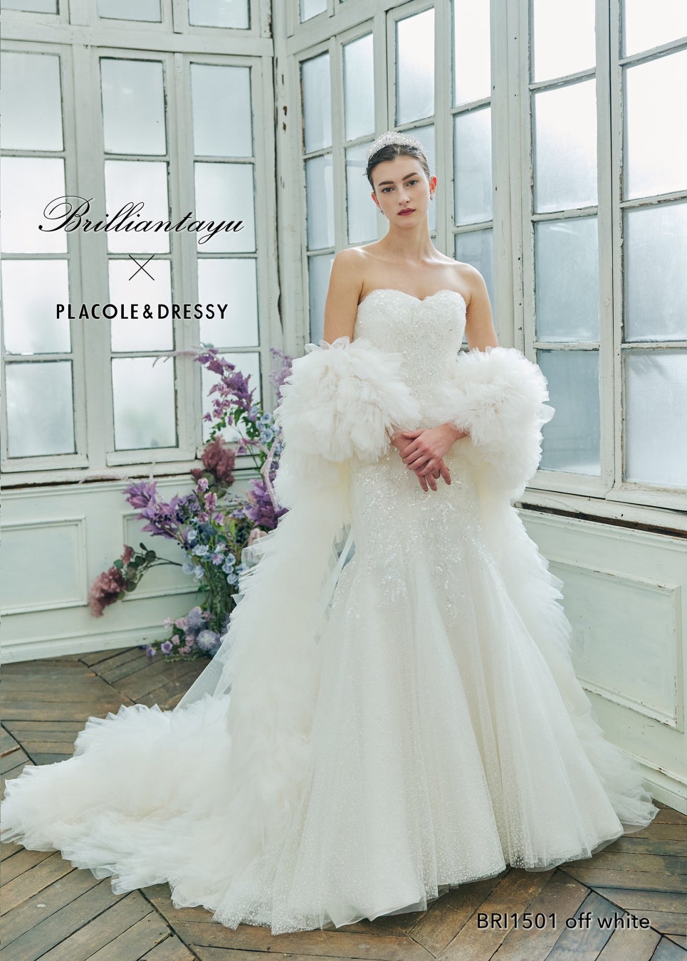 繊細に輝くグリッターチュールにスパンコールビジューレースを施して、キラキラした透明感のある光が美しい、ブリリアンターユのシグネチャーでもあるマーメードラインのウェディングドレス。たっぷりのチュールフリルで仕立てた柔らかなふわふわスリーブやトレーンで、華やかな心くすぐる甘さをプラス。スリーブ、ショール、トレーンはそれぞれ取り外しが可能で、バリエーション豊かな着こなしを楽しめます。