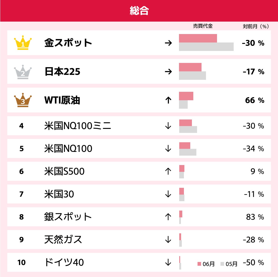 総合ランキングでは「金スポット」が首位となり、「日本225」「WTI原油」が続きました。バラエティCFDランキングは「米国VI」、商品CFDランキングでは「金スポット」、外国株CFDランキングでは「テスラ」が首位となりました。