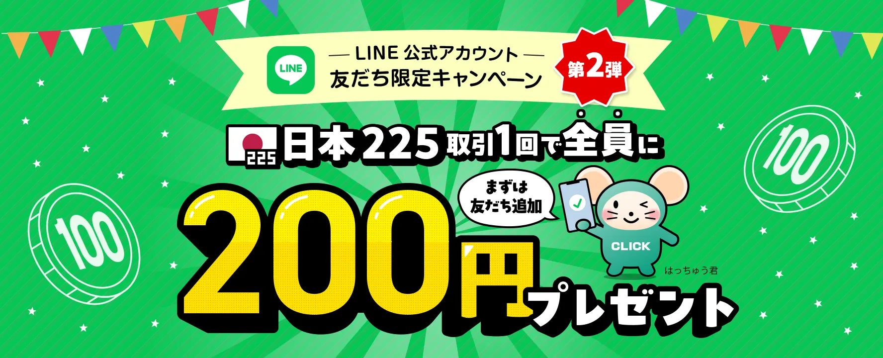 現在、当社のLINE公式アカウントを友だち追加し、株価指数CFD「日本225」を1回以上お取引されたお客様全員に200円をプレゼントするキャンペーンを実施中です。本キャンペーンの詳細及び注意事項は以下ページよりご確認ください。