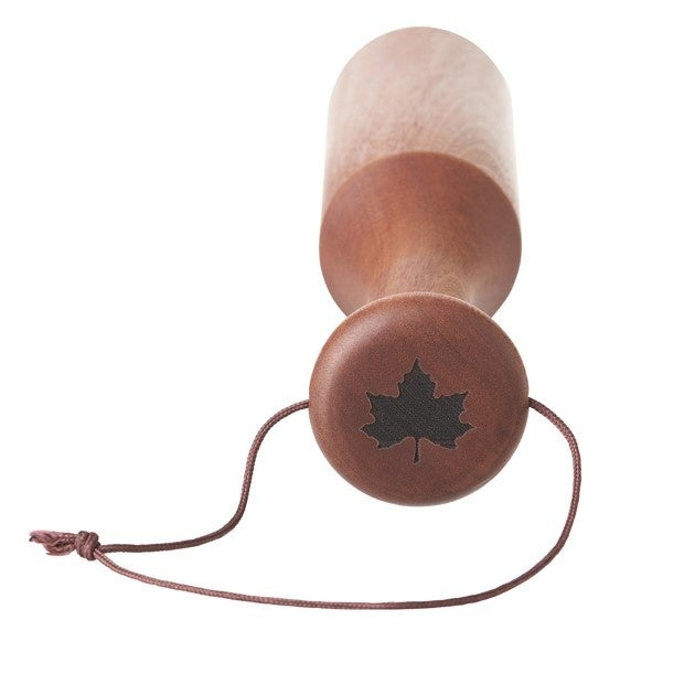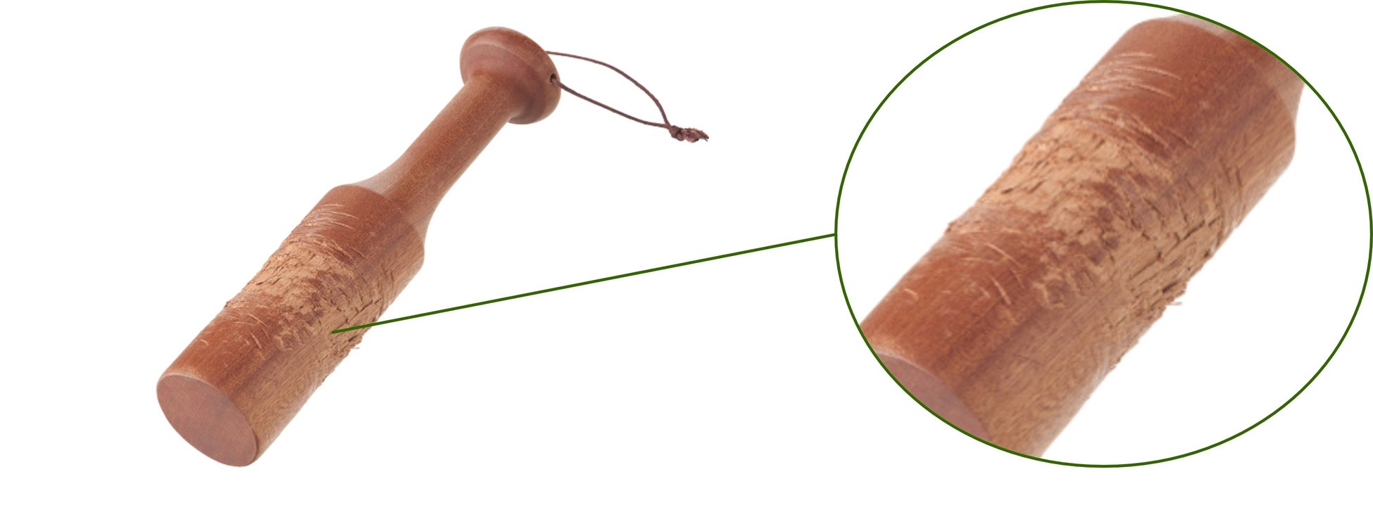 素材にはアフリカ原産の美しい木材サペリを使用し、見た目も楽しめるようナチュラルに仕上げました。無垢材からの削り出しのため、折れにくく強度もあります。グリップ後端には、LOGOSのロゴマークであるメイプルリーフロゴも入っています。また、絶妙なやわらかさで、刃物よりも柔らかいこん棒が傷つくことにより、刃物への負荷を軽減します。完全に使えなくなった際には、薪としてお使いいただけます。
